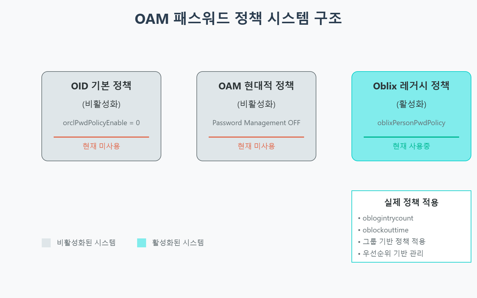 현재 시스템에서 실제로 패스워드 정책을 관리하는 것이 Oblix 레거시 시스템이라고 판단한 근거는 다음과 같습니다: